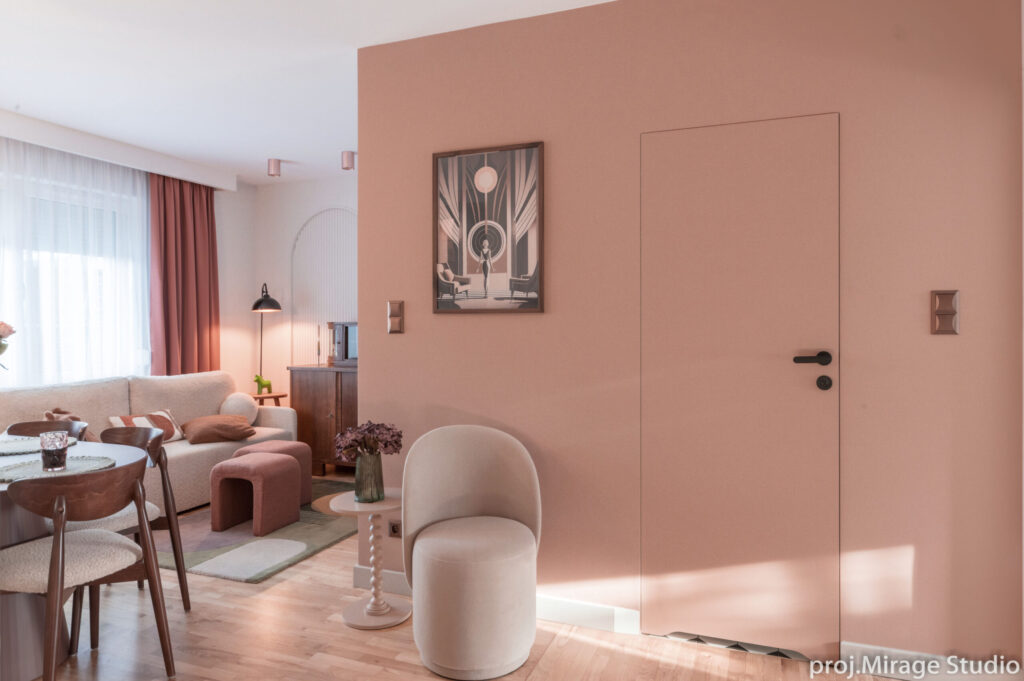 Dobrym przykładem użycia koloru Mocha Mousse jest projekt Nowe Art Deco, zrealizowany przez Mirage Studio w Warszawie, w dzielnicy Białołęka.